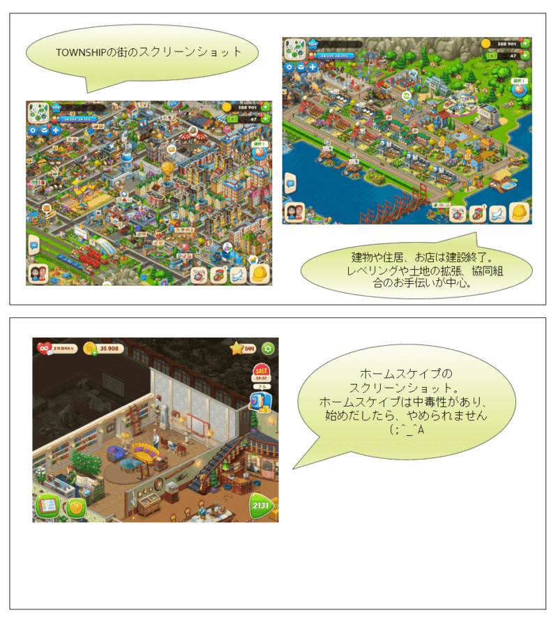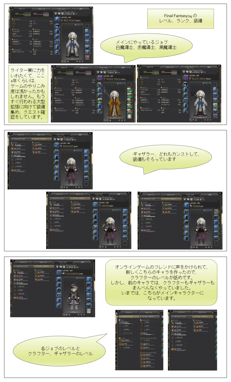 MMORPG・オンラインゲーム「FinalFantasy14」と、スマホゲーム「タウンシップ (Township)」「ホームスケイプ (Homescapes)」のキャラクター情報を画像にまとめてみました。